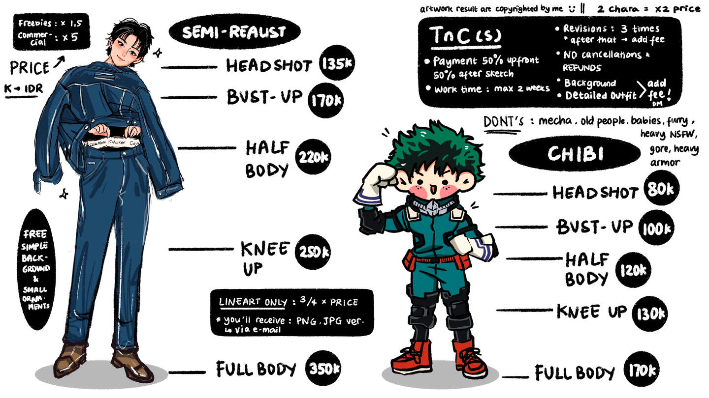 freebies : base price x 1.5 /n/n commercial use : base price x 5 (WITH VISIBLE CREDIT)